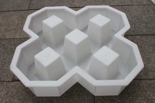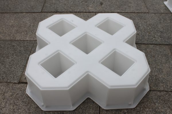 此款路面磚模具主要采用了雙八字五孔植草設計,使用聚丙烯塑料原料注塑加工而成。因其特殊的模具結構設計,可植草空間相比其他植草磚模具大大增多,直觀可見停車場專用路面磚模具所制路面磚單一植草空隙有五處,如果組合拼接鋪設,更可多增加四處,對于大面積停車場的綠色建設工程優勢明顯。