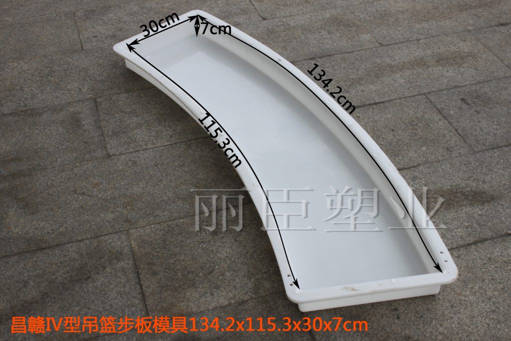 水泥吊籃步板塑料模具主要用于預制高鐵橋墩吊籃上的檢查步板,此款模具系列為昌贛高鐵線路專用,共分為I、II、III、IV四個型號,由直行吊籃步板塑料模具及彎道圓弧吊籃步板塑料模具組成,其中I型為直行樣式,II、III、IV為圓弧樣式。