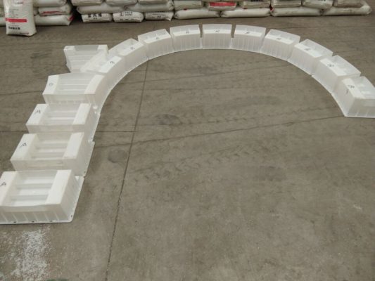 雙拱結(jié)構(gòu)的水泥拱形骨架護坡模具套裝產(chǎn)品,主要用于國家高鐵、高速山體邊坡護坡工程,共分為A、B、C、D四個部分,A為拱形骨架護坡模具基座,B為拱形磚,C為三角接縫磚,D則是雙拱開口磚。