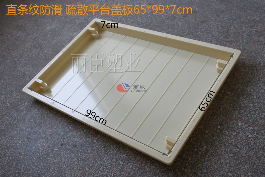 這款直條紋疏散平臺蓋板塑模設計上與別的疏散蓋板不同,以直條紋的形式來作為主要設計圖案,條紋的設計能有效加大人與地面的摩擦力,即便在潮濕的地面上也能較好的減少人的滑倒。四周都設計了缺口堵頭,對后期安裝上也能有效的減少安裝時間。