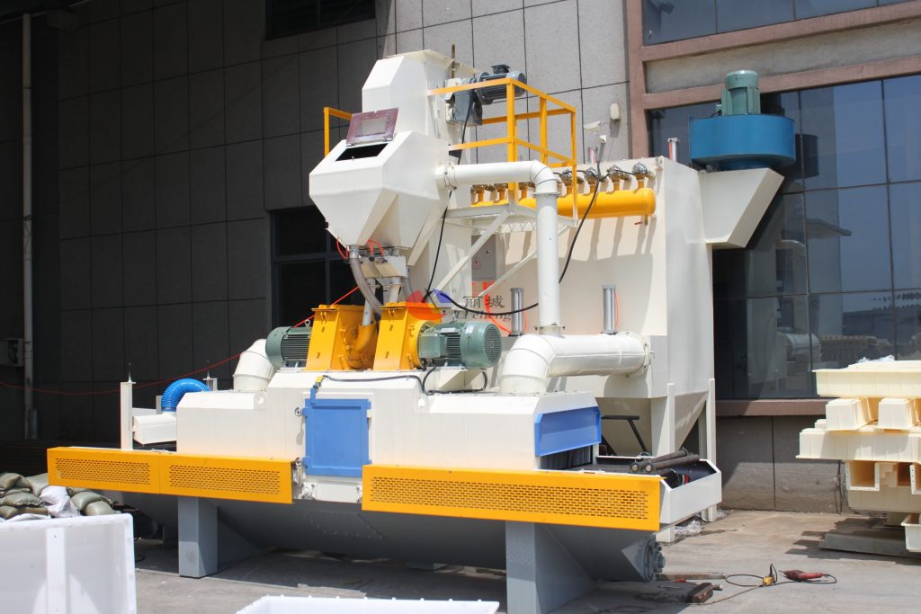 5.在對(duì)于步道磚水泥制品表面打擊完成后,鐵砂會(huì)掉落到分離器的斗料中,經(jīng)彈丸輸送系統(tǒng)由拋丸器拋出,從而達(dá)到鐵砂二次使用。