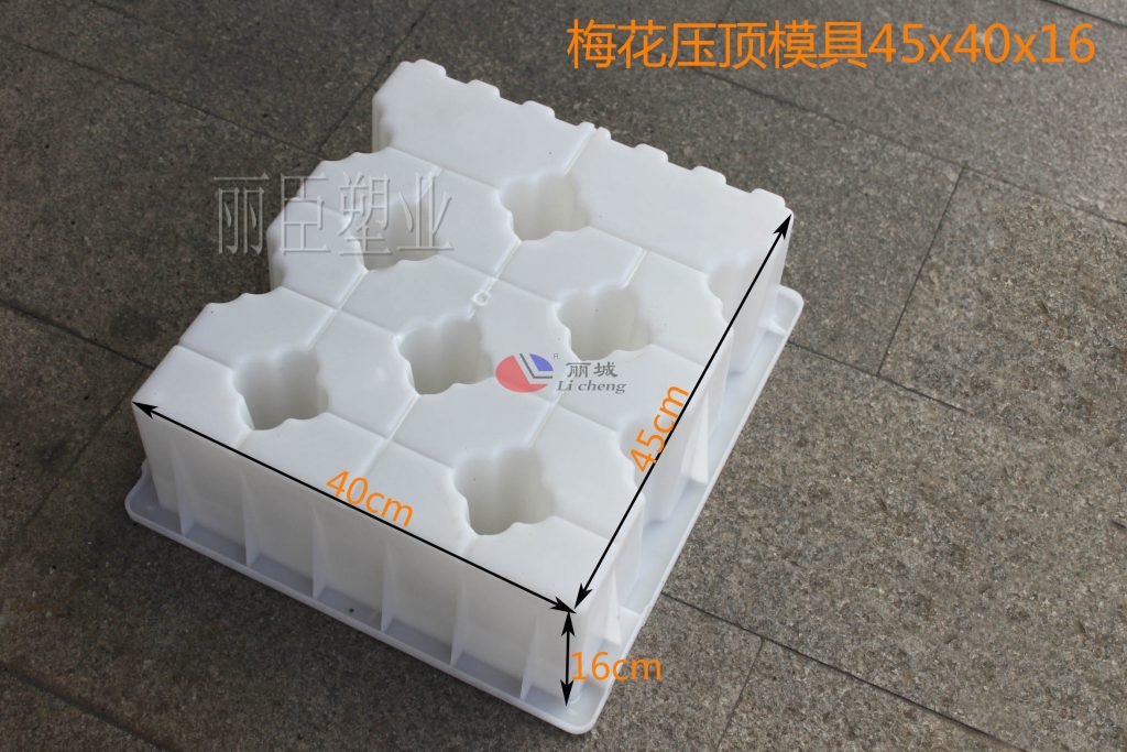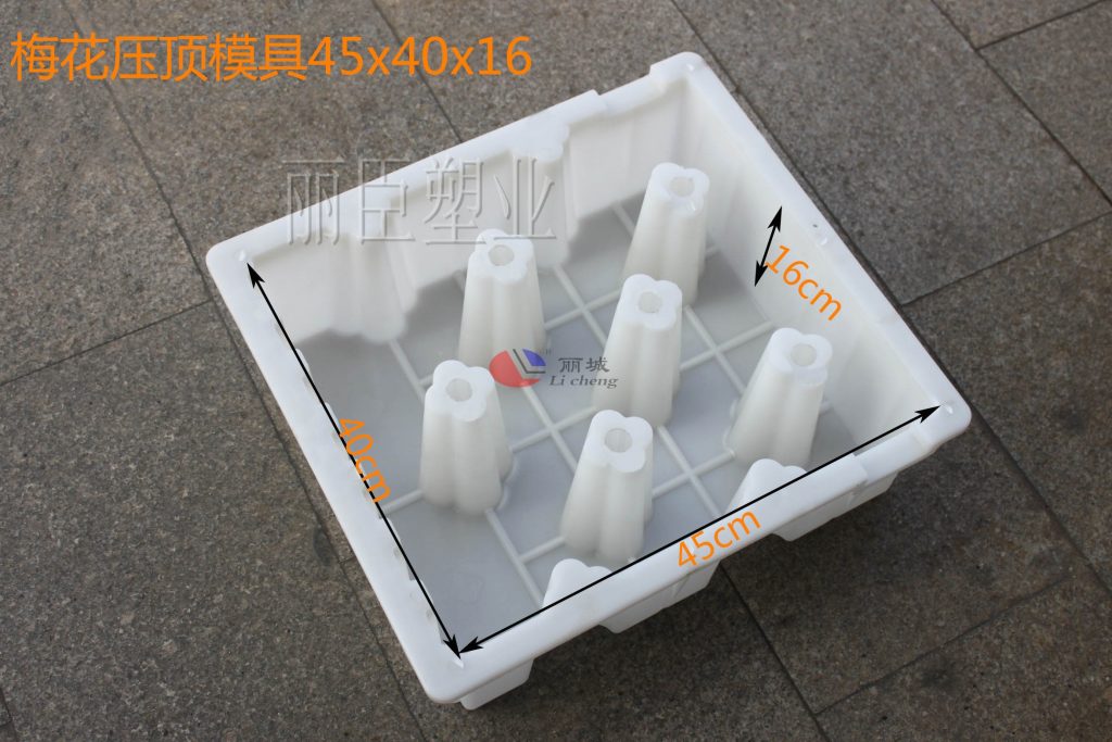 這款壓頂塑料模具是與之前那款水利護岸模具40x40x20-21cm互相搭配而設計研發的。梅花壓頂塑料模具設計主體外觀呈現長方形,壓頂模具上方有設計壓條配置,下面就跟著小編一起去詳細的了解一下這款梅花型水利壓頂模具吧。