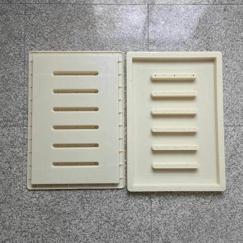 這款塑料雨水蓖模具厚度只有3cm,長寬尺寸為60cm*40cm,他主要用于下水、流水蓋板活性混凝土預(yù)制(RPC)預(yù)制,他的厚度較薄,與一般材質(zhì)的雨水蓋模具不同,他采用的材質(zhì)是ABS材質(zhì),這種材質(zhì)質(zhì)地比PP材質(zhì)硬,強(qiáng)度大,使用次數(shù)多,這種模具主要預(yù)制成型雨水蓋板,普通用于市政道路路面排水使用。他一共有六個排水孔,排水效果很好。水流效果比較好