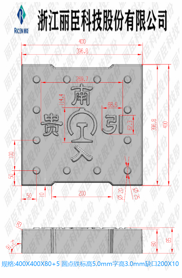 貴南引入系列蓋板,主要用于高鐵隧道蓋板定制系列、蓋板為缺口圓點帶鐵標、板面帶字,為“貴南引入”。這款系列有三款尺寸蓋板尺寸分別為40cm*30cm、40cm*40cm、80cm*50cm、厚度相同為8cm厚,且三款模具的缺口也不同從小到大的尺寸缺口為10cm、20cm、30cm缺口,這款蓋板為2022年新生產(chǎn)的蓋板。